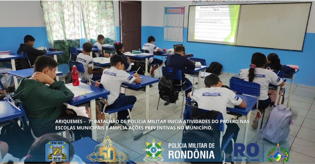 No primeiro semestre de 2026, O 7º Batalhão de Polícia Militar do Estado de Rondônia deu início às atividades do Programa Educacional de Resistência às Drogas e à Violência (PROERD) nas escolas municipais de Ariquemes, em ação desenvolvida pela Unidade em parceria com as Secretarias Municipal e Estadual de Educação. Espera-se que neste 1º semestre o programa alcance mais de 600 alunos do ensino fundamental, incluindo turmas dos 5º anos, além de estudantes do 2º e 4º ano contemplados com currículo adaptado.