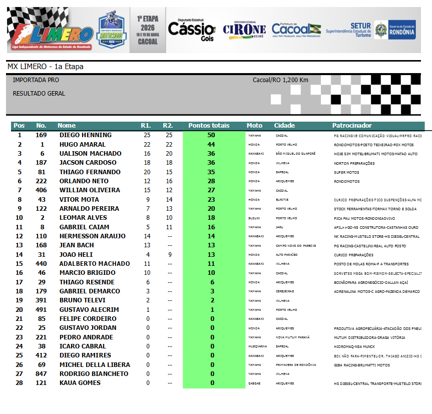 Na categoria principal e mais aguardada do certame, a festa foi completa para os anfitriões. Diego Henning #169, piloto de Cacoal, fez a prova com sua Yamaha, vencendo as duas baterias e faturando a pontuação máxima de 50 pontos. Na segunda colocação, o experiente Hugo Amaral #1 (Porto Velho), marcando 44 pontos com sua Honda. Fechando o pódio em terceiro, o piloto Ualison Machado #6, de São Miguel do Guaporé, somou 36 pontos. Em quarto lugar ficou Jacson Cardoso #187 (Vilhena), seguido por Thiago Fernando #81 (Sapezal) na quinta posição.