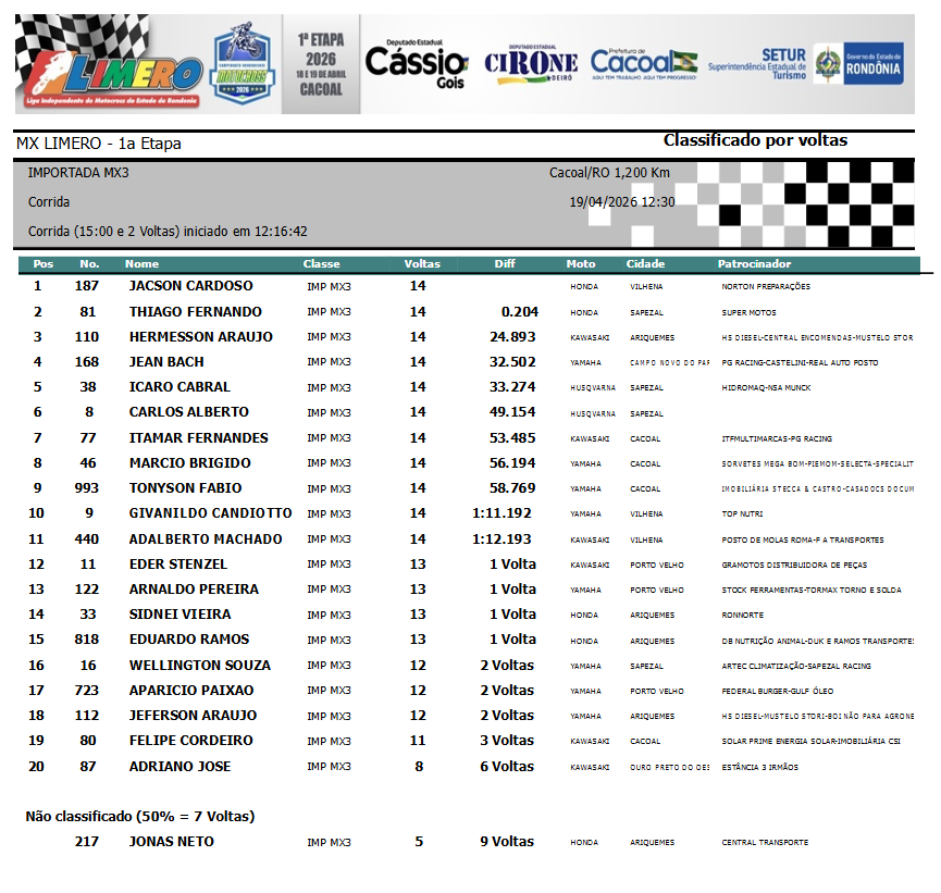 Na Importada MX3, Jacson Cardoso #187 (Vilhena) levou a melhor em um duelo eletrizante contra Thiago Fernando #81 (Sapezal), garantindo a vitória com uma margem mínima de apenas 0.204 segundos frente ao rival. Hermesson Araujo #110 (Ariquemes) garantiu o terceiro lugar. Completando o pódio, Jean Bach #168 (Campo Novo do Parecis) ficou em quarto, e Ícaro Cabral #38 (Sapezal) em quinto.