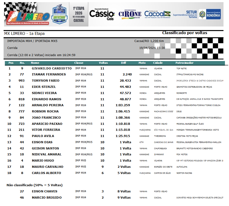 Já na bateria das Importadas MX4/MX5, Givanildo Candiotto #9 (Vilhena) foi o grande campeão, mas a torcida de Cacoal celebrou o segundo e o terceiro lugares, conquistados pelos pilotos da casa Itamar Fernandes #77 e Tonyson Fabio #993, respectivamente. Completaram os cinco primeiros da bateria conjunta Eder Stenzel #11 (Porto Velho) na quarta posição e Sidnei Vieira #33 (Ariquemes) em quinto.