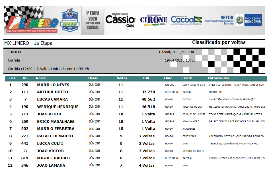 Na Júnior, a vitória ficou com Murillo Neves #290, de Alta Floresta do Oeste. Acelerando em casa, as jovens promessas de Cacoal, Arthur Dotto #111 e Lucas Camara #7, completaram o pódio em segundo e terceiro lugares. Werique Henrique #190 (Rolim de Moura) e Joao Vitor #712 (Conquista D'Oeste) garantiram a quarta e quinta posições na categoria.