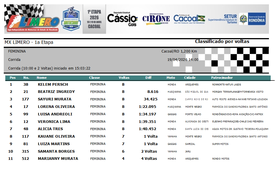 Kelem Persch #38 (Ariquemes) conquistou a vitória com sua Honda. Em uma prova consistente, Beatriz Ingredy #21 (São Miguel do Guaporé) garantiu a segunda colocação, seguida por Sayuri Murata #177 (Campo Novo de Rondônia), que confirmou a boa fase e subiu ao pódio em terceiro lugar. Lorena Oliveira #17 (Monte Negro) fechou em quarto lugar e Luisa Andreoli #99 (Porto Velho) na quinta colocação.
