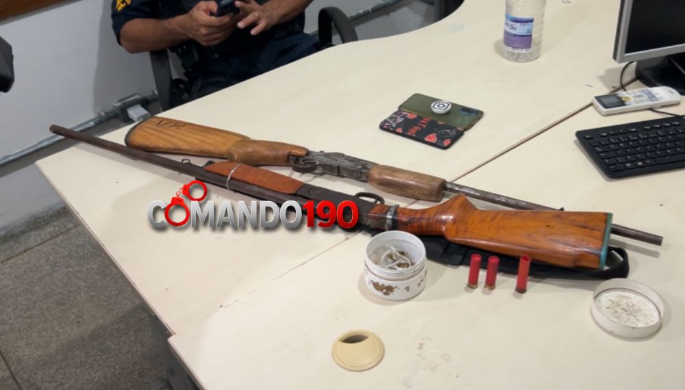 Uma equipe da Polícia Militar apreendeu armas de fogo de fabricação artesanal e uma porção de droga durante uma ocorrência registrada na noite desta quarta-feira, no Setor 03. A ação teve início após denúncia de movimentação suspeita e som automotivo em volume excessivo em uma residência localizada em via pública.